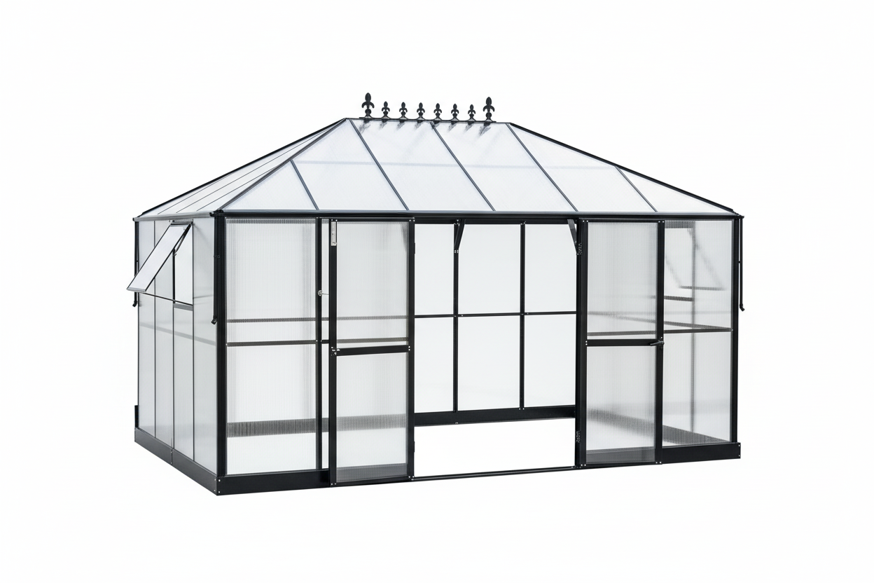 The 10x14FT Premium Polycarbonate Walk-In Greenhouse features 6mm twin-wall translucent PC panels with 99.99% UV protection and 90% light transmission. Upgraded 6FT wall height and two wide swing doors for easy access. Rust-resistant aluminum frame with 1.5mm uprights rated for wind resistance up to 70mph and snow loads up to 30 psf. Victorian roof crest deters birds from perching. Two 8-level adjustable side vents for precise airflow control. Built-in drainage holes with attached pipes for water collection. Free US shipping — ships 1–3 days, delivered 5–10 days.