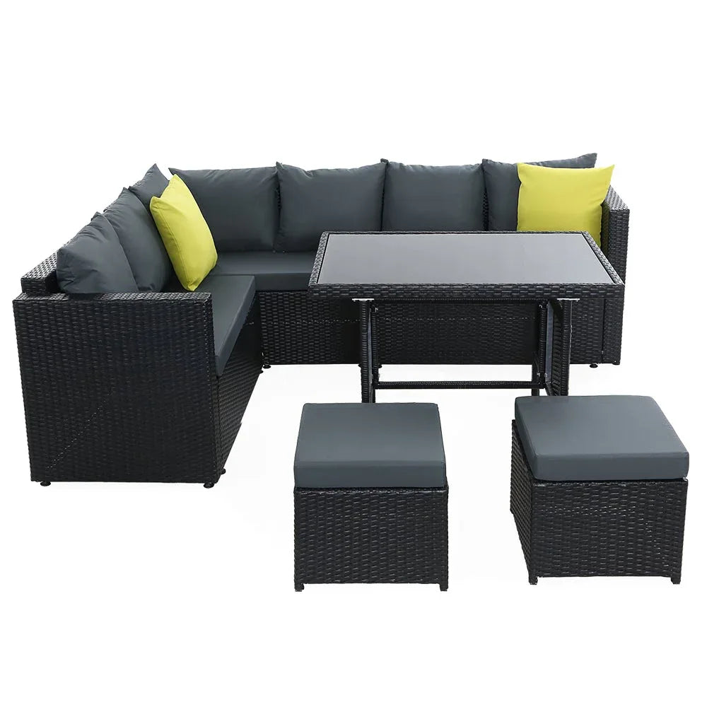 Invite your friends and family over for a garden party or just sit back and relax with our luxurious Gardeon Outdoor Sofa Dining Set. Being a multi-seater, the dining set provides enough room for all your guests to sit or for you to have a lie down and enjoy a book. You can arrange the seats (double seat, corner seat and ottoman) in various ways depending on your needs. The sofa is made of sturdy powder-coated steel frame with quality PE wicker finish that not only looks stylish but is perfect for outdoor use as it is both UV-resistant and weather-resistant. The seat cushions are 8cm thick to provide ultimate comfort and are water-resistant as well. The set also includes a matching table that has a 5mm thick tempered glass top with buffers for added protection.
