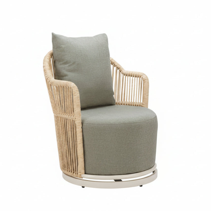 The combination of olefin outdoor fabric, powder-coated aluminum, and synthetic rattan weave gives this chair a balanced look that works well in both casual and more refined outdoor settings. The swivel base also makes it easier to turn toward conversation, views, or nearby seating without moving the whole chair.