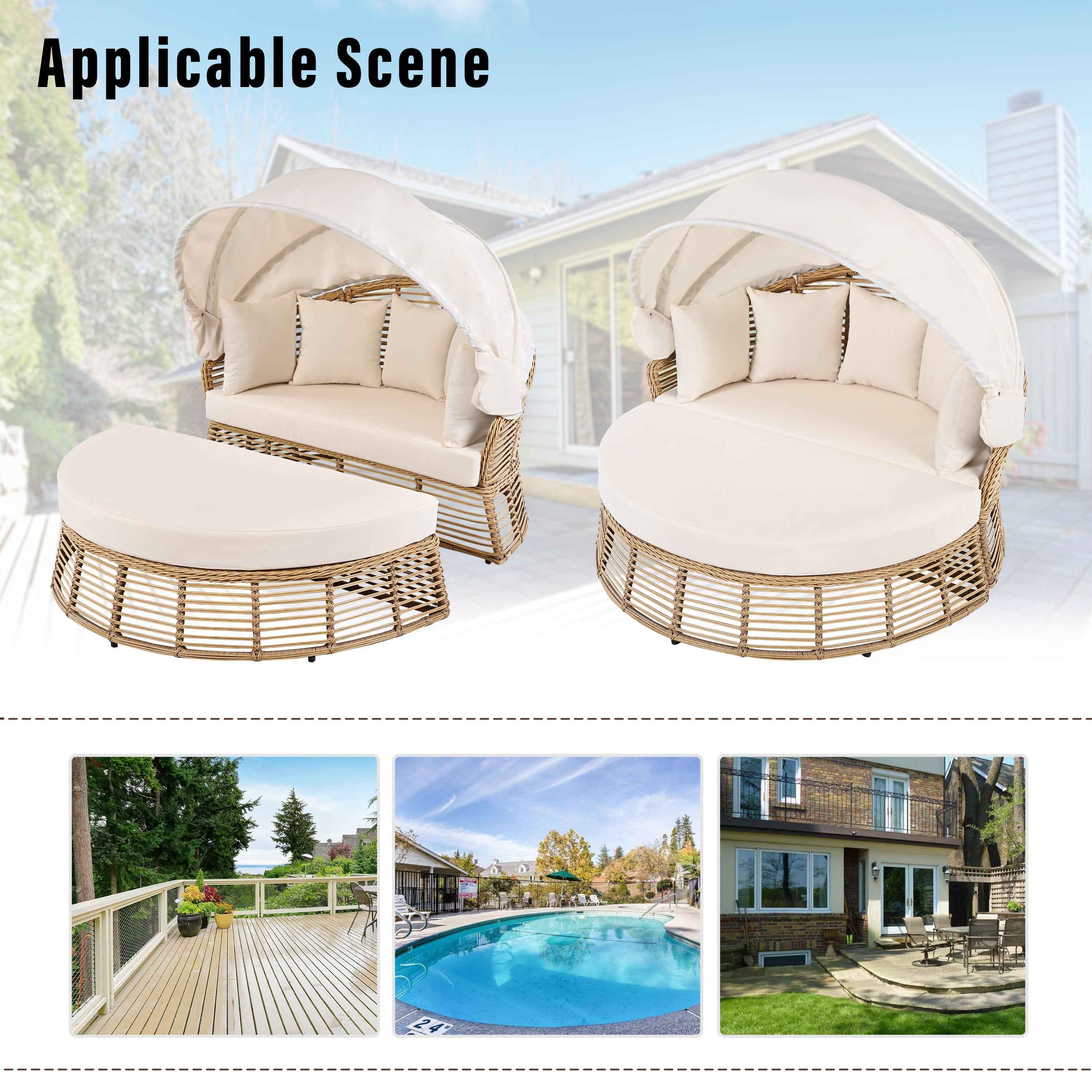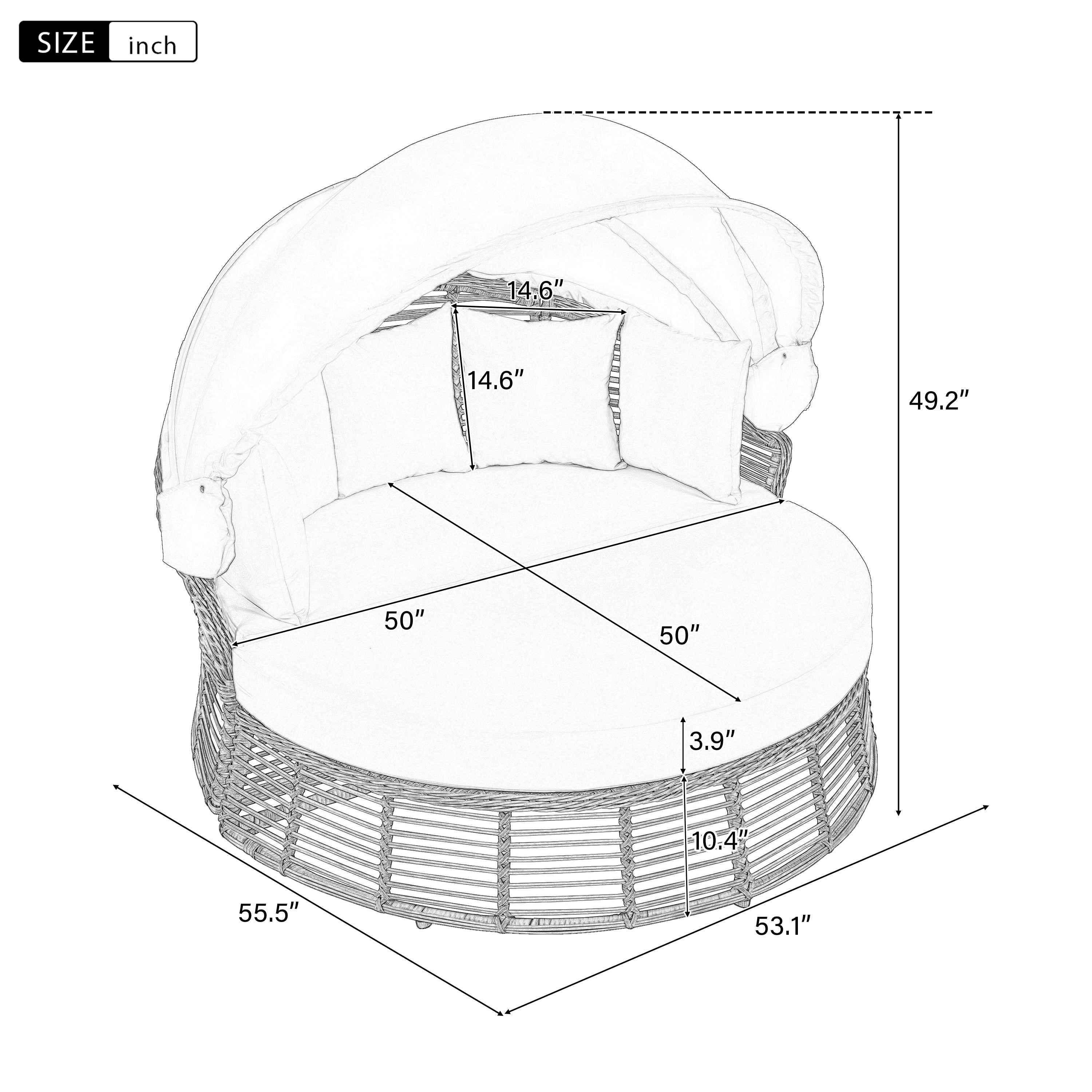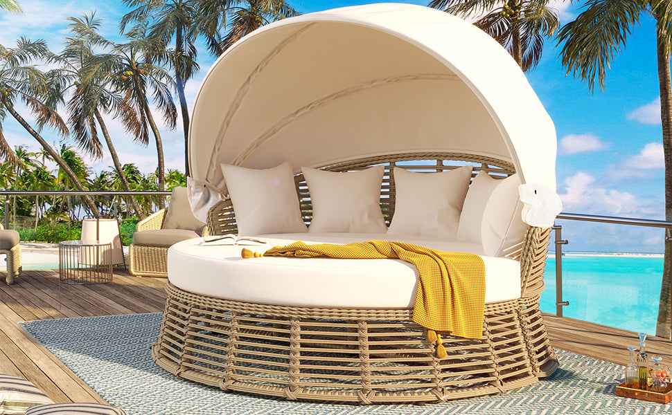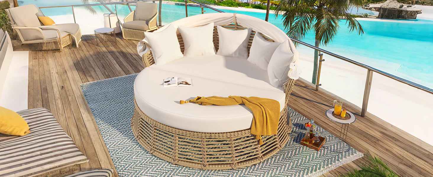 This Outdoor Rattan Round Daybed features a wicker frame with a retractable canopy for adjustable sun protection. Waterproof polyester cushions in beige with foam fill. Removable cushion covers for easy washing. Suitable for patios, gardens, poolside, and decks. Simple assembly required.