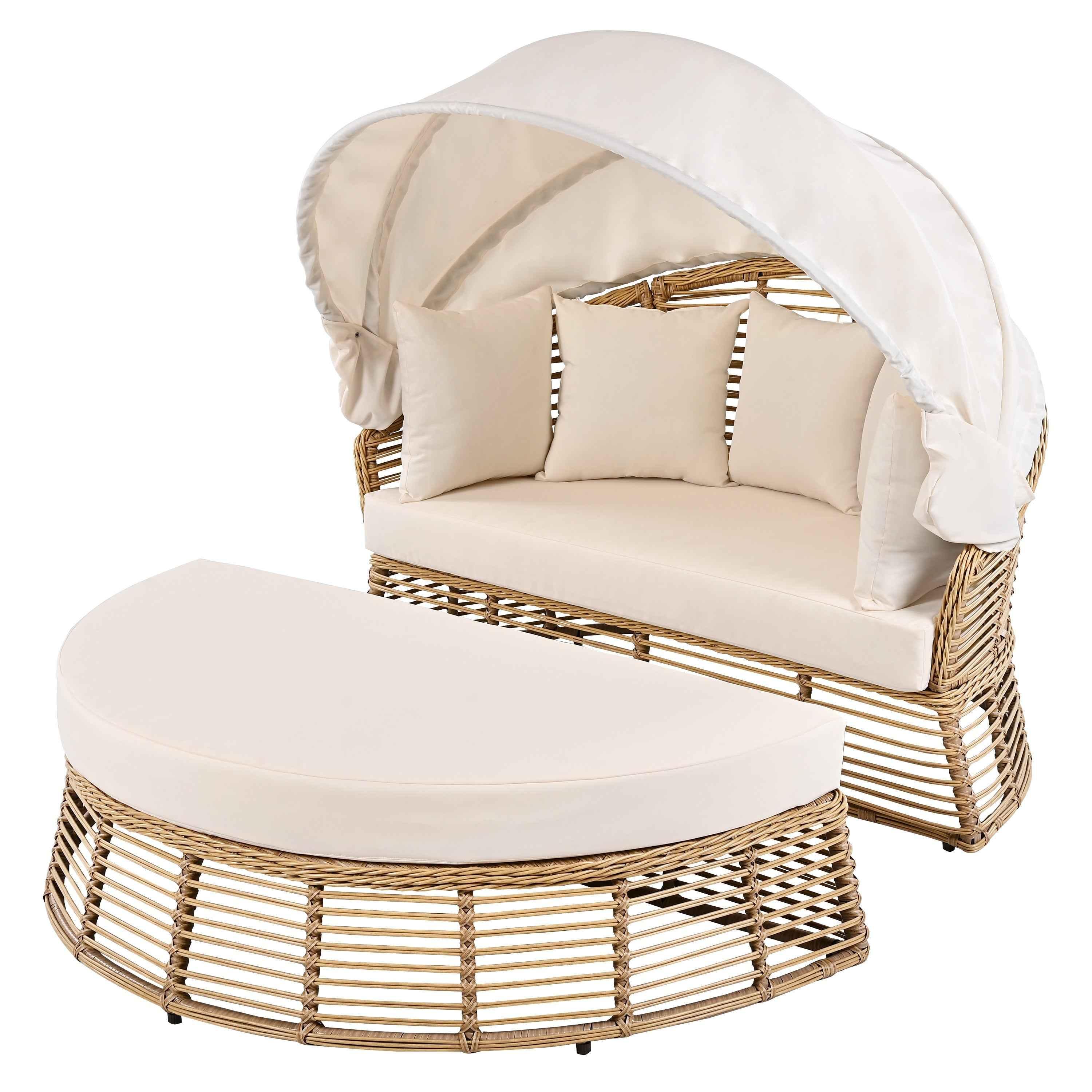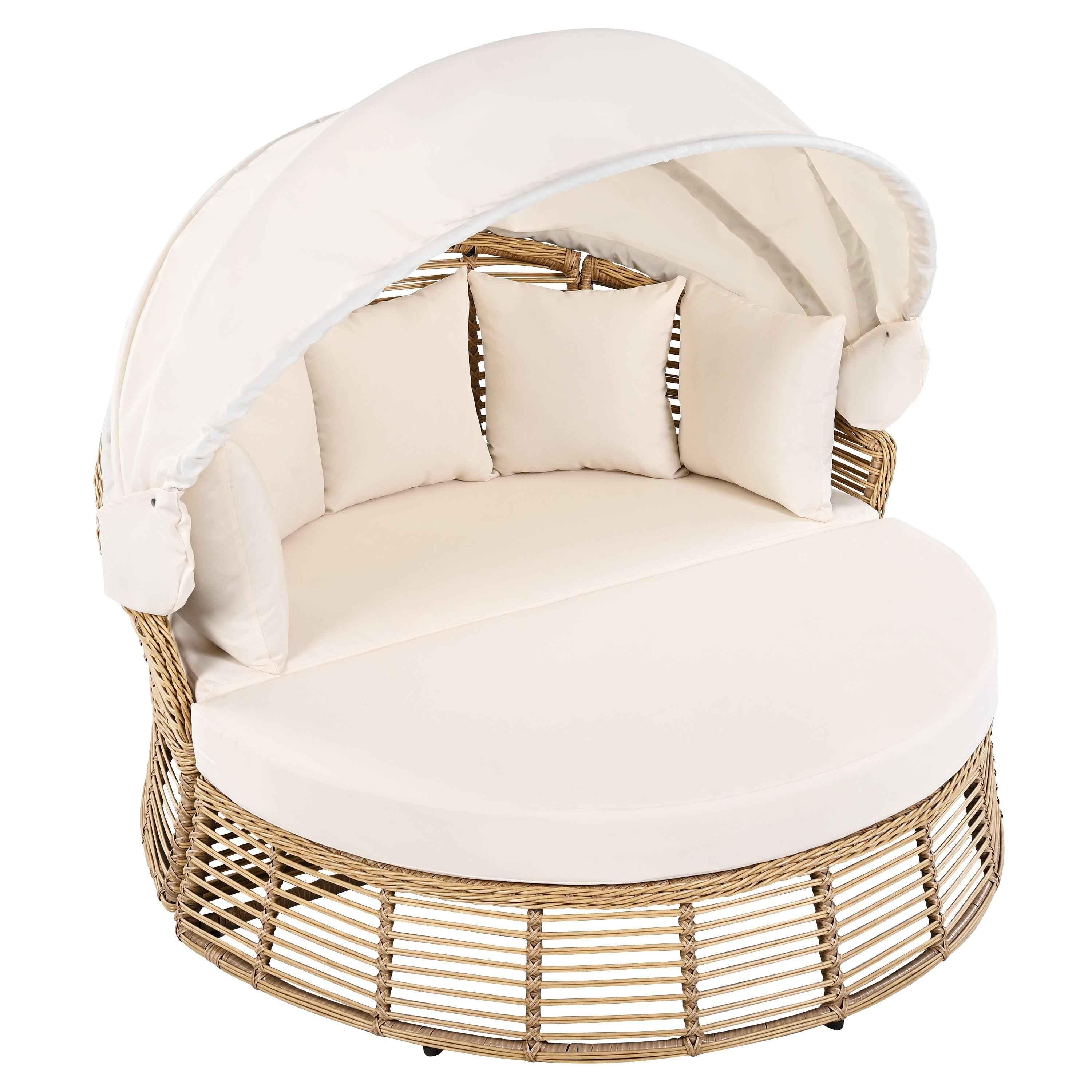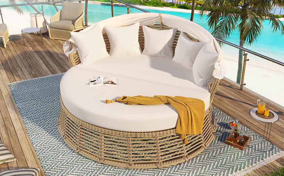 Outdoor Patio Rattan Round Daybed with Retractable Canopy, Wicker